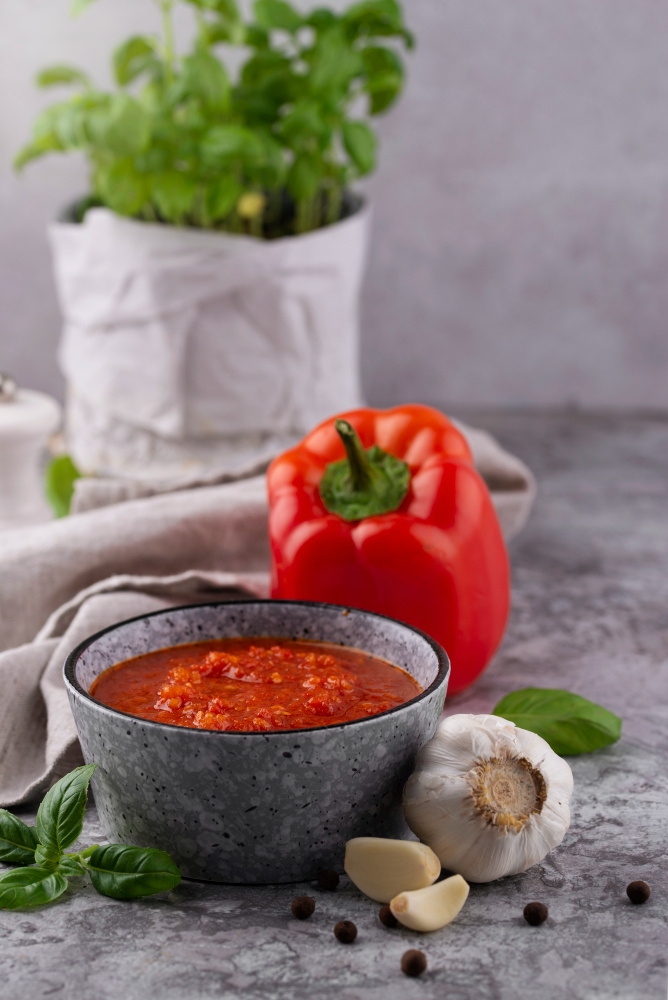 Poivrons 28% (ANHYDRIDE SULFUREUX), Tomates (concentré de tomates, dés de tomates, jus de tomates), Huile de tournesol, Fromage Mozzarella 13% (LAIT), Oignons, Sel marin, Fructose, Piment (en poudre), Ail, Poivre noir moulu, Fibres végétales, Arômes naturel, Amidon modifié de maïs, Correcteur d(acidité: Acide lactique. Sans gluten.